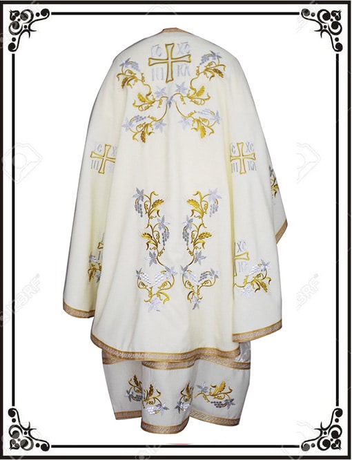 Broderiile cu struguri și spice amintesc de rodul pământului și binecuvântarea divină. Aceste motive liturgice dau veșmintelor profunzime spirituală și o frumusețe solemnă.